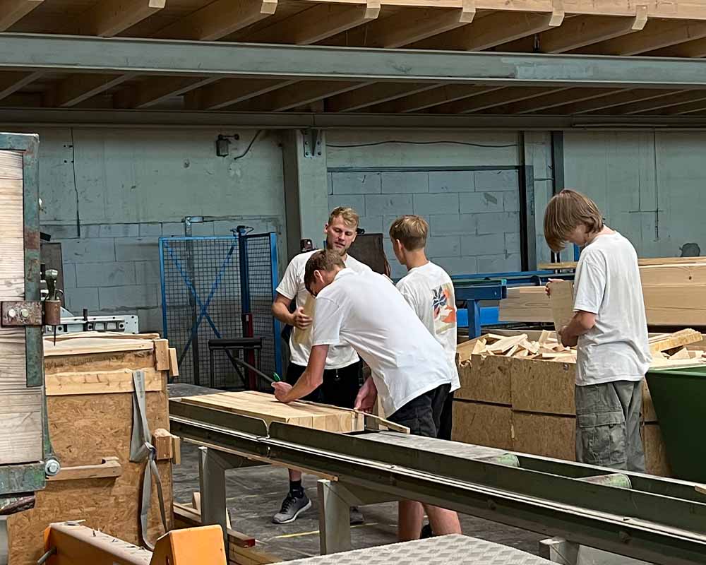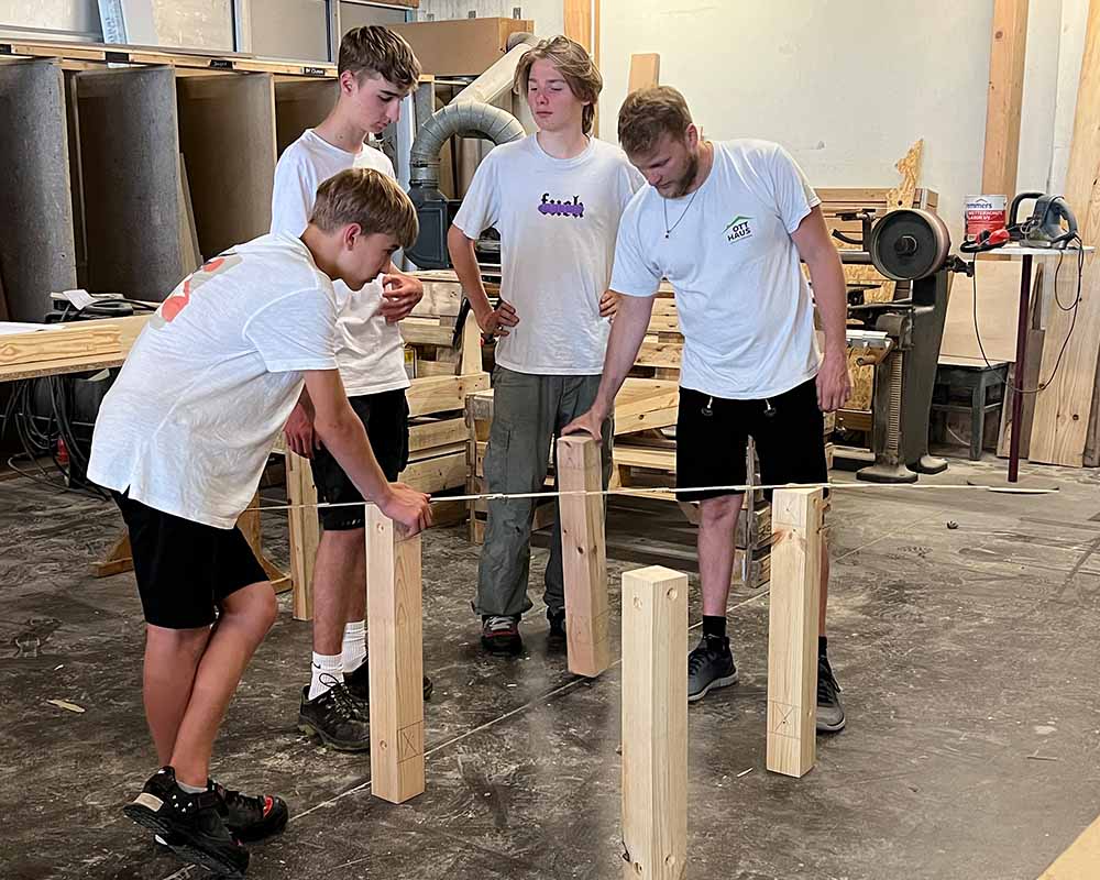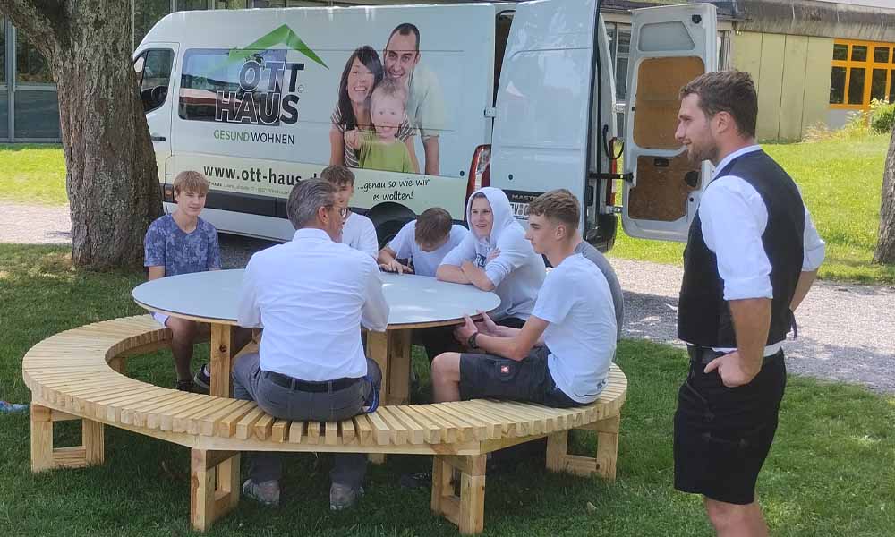 Zehn Schüler trafen sich somit einmal wöchentlich über mehrere Wochen hinweg in der Produktionshalle von OTT HAUS, um dort gemeinsam mit unseren erfahrenen Zimmerern ihre eigene Sitzgelegenheit zu planen und zu bauen.