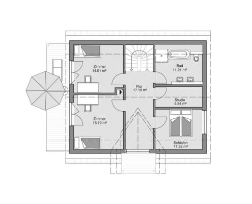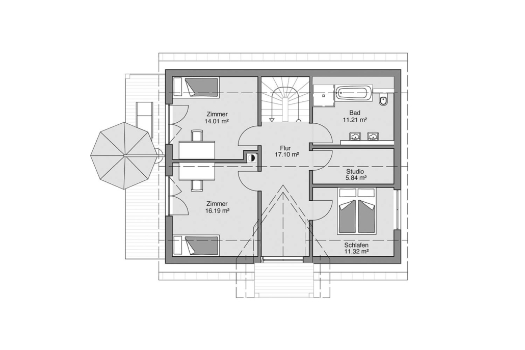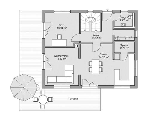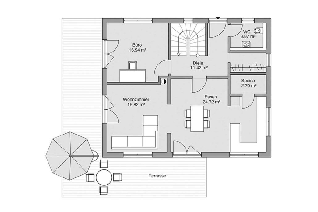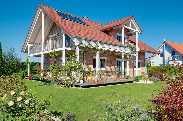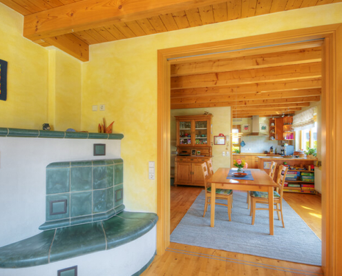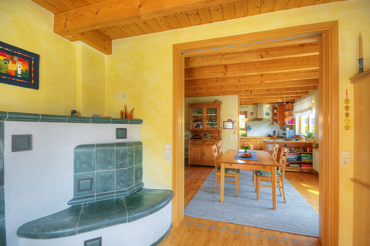 Die Verbundenheit zur Natur und zum Leben in ländlichem Ambiente findet in diesem Haus ihren Ausdruck. Mit der optisch ansprechenden Holzfassade und den großen Dachüberständen fügt es sich harmonisch in die Landschaft ein, holt den Garten auf die Terrasse und durch die großen Fenster auch ins Haus hinein. Durch sichtbare Holzdecken und die ansprechende Raumgestaltung entstehen warme Lichteffekte und eine Atmosphäre der Gemütlichkeit. Auf Wunsch bauen wir für Sie auch einen Kachelofen ein, der an kalten Tagen für noch mehr Behaglichkeit sorgt.