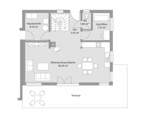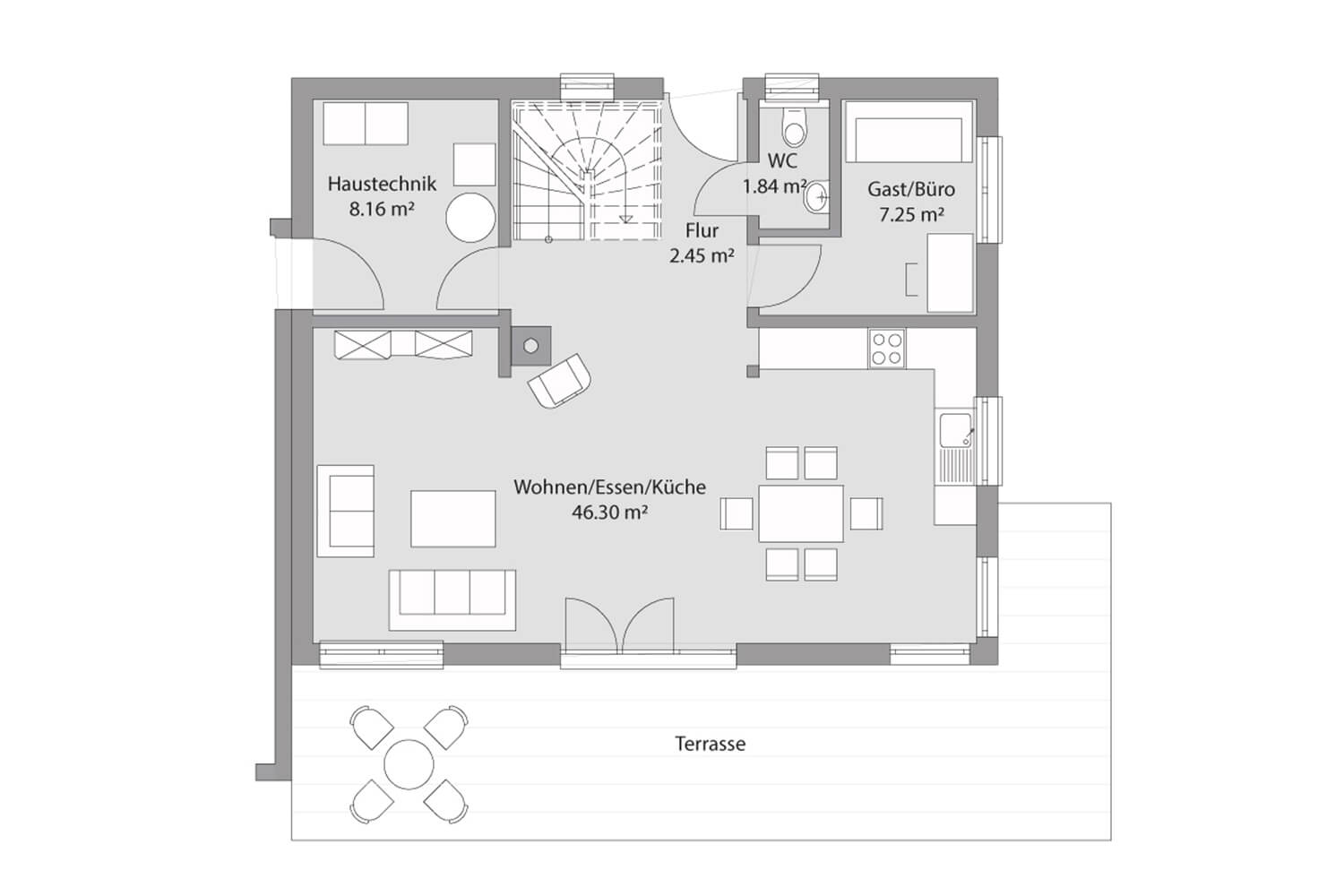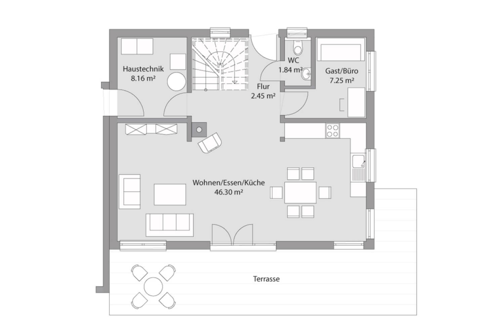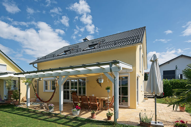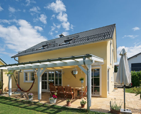 Dieses Haus besticht durch seine Großzügigkeit. Die bodentiefen Fenster lassen viel Licht in den offenen Wohn-/Essbereich und die überdachte Terrasse erweitert das Wohnzimmer in Richtung Garten. Warm und einladend sind die weißen Sprossenfenster in Kombination mit der Farbgebung der Fassade. Ganz viel Raum zum Spielen und Toben mit den Freunden bieten die sehr geräumigen Kinderzimmer im Dachgeschoss. Die zusätzlichen Dachfenster sorgen für Helligkeit und Aussicht. In der kalten Jahreszeit lässt es sich dank des Kaminofens im Wohnzimmer schön kuscheln.