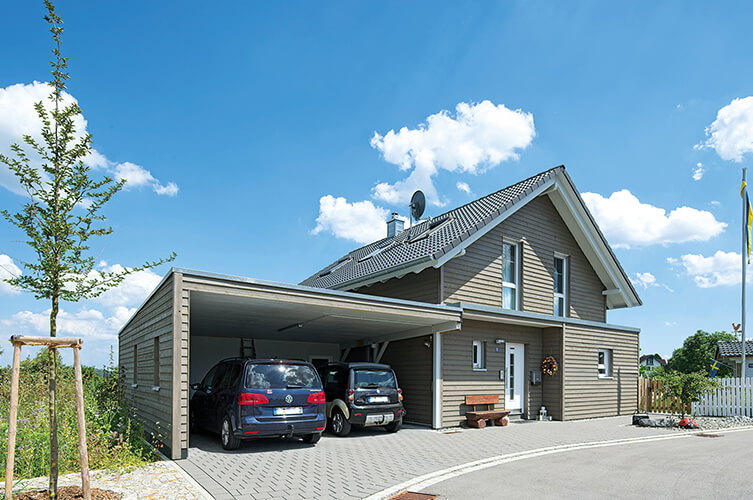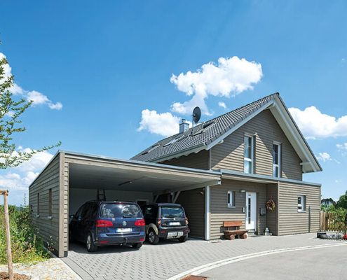 Die Bauherren wünschten sich ein Haus mit „Ecken und Kanten“, es sollte abweichen vom Rechteck. Sprossenfenster lassen den Eindruck der Fassade nordisch wirken, abweichend von kühler, moderner Architektur. Die Holzfassade strahlt schon von außen Wärme aus, die auch im Inneren herrscht. Das Haus bietet ganz viel Raum für Gemeinsamkeit durch den großen Wohn-/Essbereich und die überdachte Terrasse öffnet geschützt den Außenraum. Komfortabel: Der Eingang mit dem Rücksprung schafft Zugang in den Carport und man gelangt trockenen Fußes ins Haus.