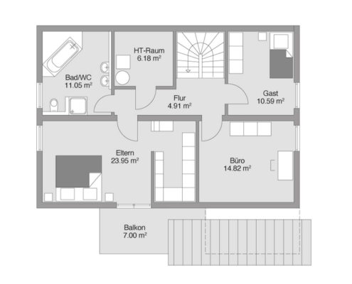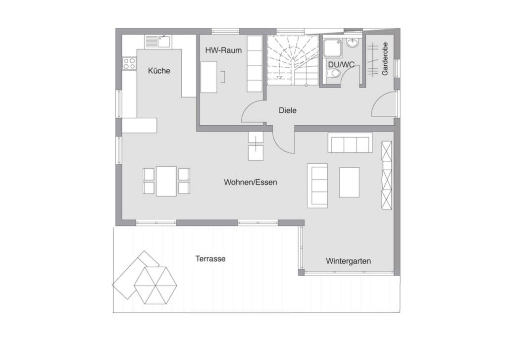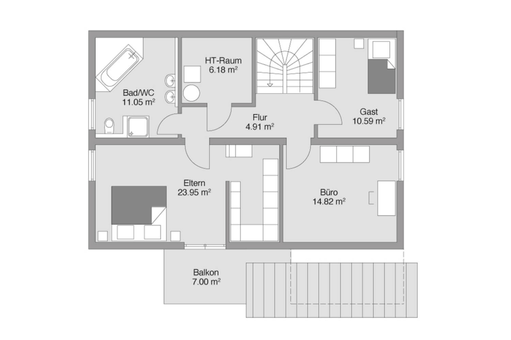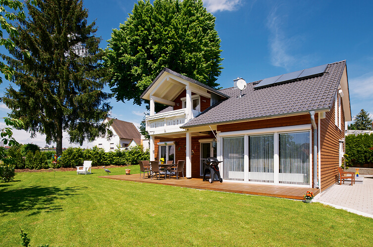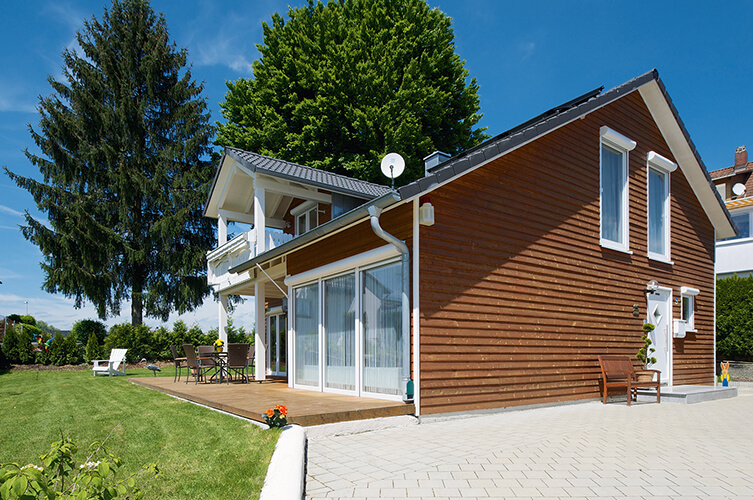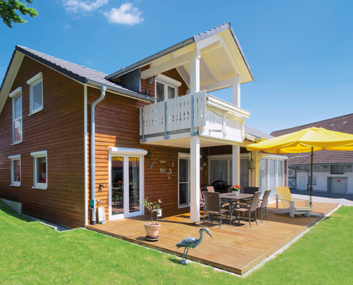 Verwirklichen Sie den amerikanischen Traum vom Wohnen genau da, wo Sie daheim sein möchten. Der vorgezogene dritte Giebel spendet Ihnen oben einen geräumigen Freisitz und im Erdgeschoss eine großzügige Überdachung für Ihre Terrasse. Die schöne Holzfassade mit ihren weißen Elementen gibt dem Haus den besonderen Look. Auch im Innenbereich vermitteln sichtbare Holzelemente ein Gefühl von Wärme und Behaglichkeit.