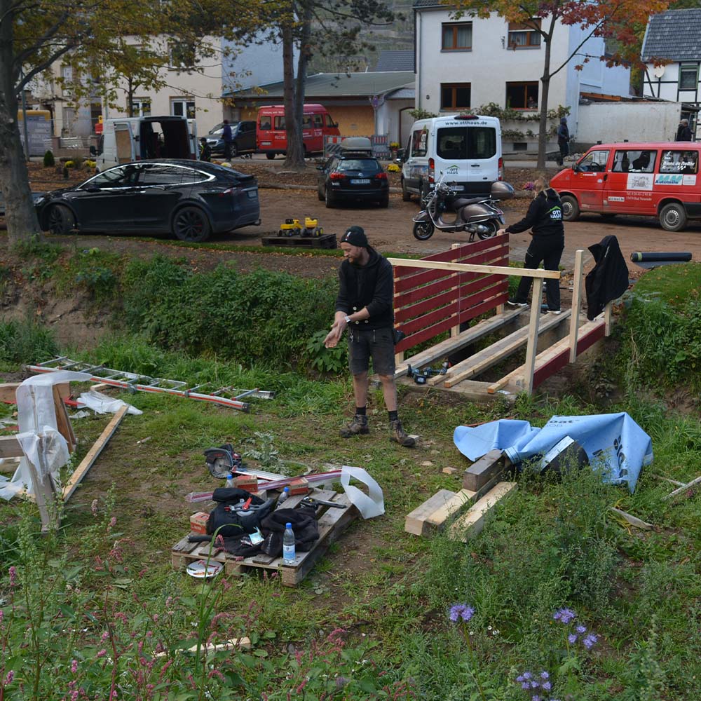 Die nächsten beiden Tage begannen früh. Wir dichteten das Dach des Anbaus ab, bauten eine Terrasse neu, verlegten Böden, bauten Schränke und Ablagen und bauten eine Brücke auf einem Kinderspielplatz, die von den Fluten der Ahr weggerissen wurde.