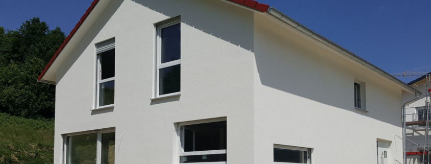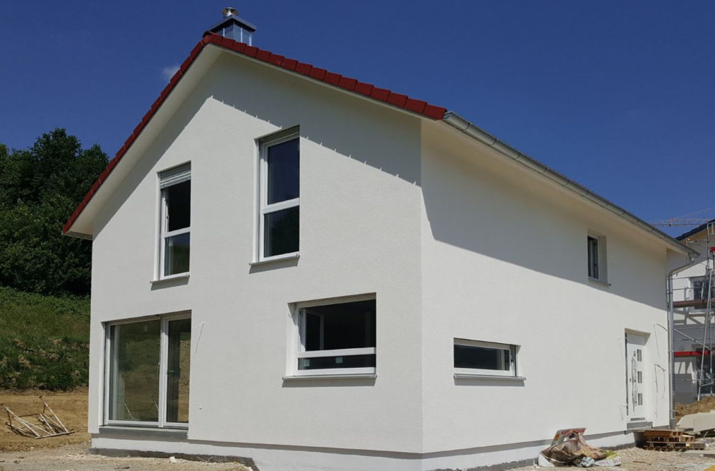 Inzwischen sind die Arbeiten an diesem modernen Einfamilienhaus mit eineinhalb Geschossen und Keller weit fortgeschritten. Schon bald kann die junge Familie in ihr schönes, helles und geräumiges neues Zuhause einziehen.