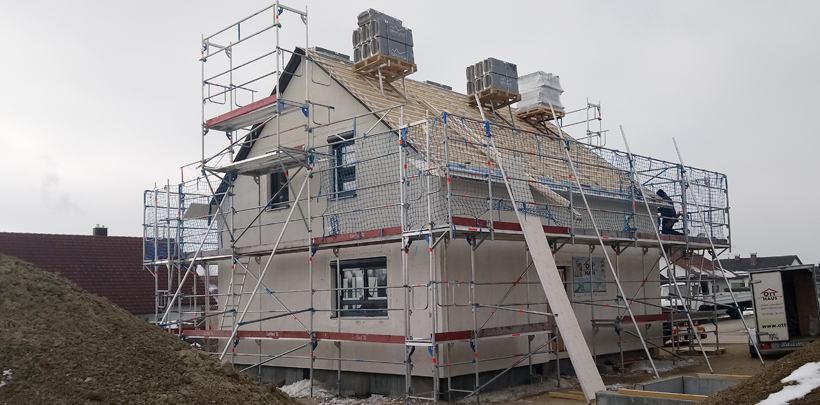 Dieses moderne Einfamilienhaus mit Keller und Carport in Ebersbach-Musbach wurde erst kürzlich aufgestellt. Es befindet sich momentan im Rohbau, die Fenster wurden bereits im Werk eingebaut und in Kürze werden die Installationen von Strom, Heizung & Sanitär Fahrt aufnehmen.