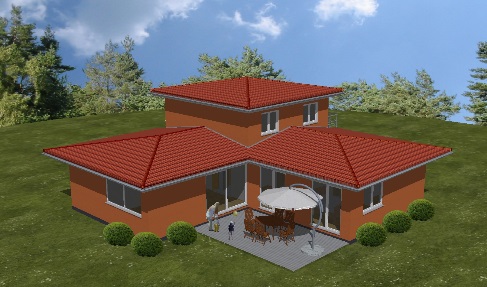 Der Effizienz 70-Bungalow mit Eck-Turmgeschoss im mediterranen Stil besticht durch großzügige Räume und einer schönen Terrasse. Er verfügt über eine dezentrale Lüftungsanlage mit Einzellüftern in den Außenwänden.