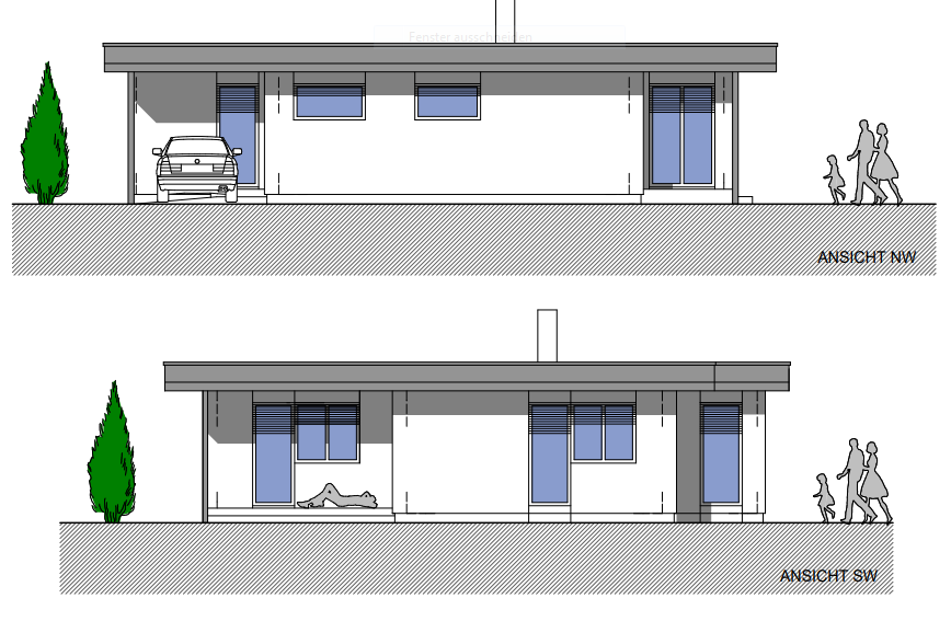 Highlight bei diesem Bauvorhaben: die Heizung erfolgt als Ganzholzheizung. Es ist ein Holzofen inklusive Schornstein, der in der Küche als Herd zum Einsatz kommt und das warme Wasser in den Pufferspeicher liefert. Der Bungalow verfügt ebenso über eine Fußbodenheizung. Die Räume sind mit großen Fenstern ausgestattet, hell soll es sein!