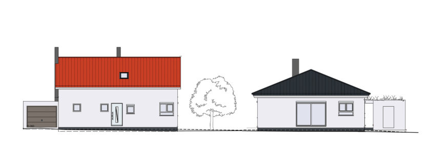 Hier handelt es sich um einen Bungalow mit Bodenplatte und einer reinen Wohnfläche von ca. 120 Quadratmetern. Die Dachkonstruktion ist ein Walmdach, ausgebildet mit Binderelementen.